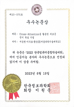 수상논문 “Cross-Attention을 활용한 새로운 전이 학습 기법”은 기 학습된 모델의 전이 학습을 효과적으로 수행하기 위한 확률적 cross-attention 기법을 제안하고 그 효과를 실험적으로 검증했고, “임의 텍스트 미세조정 학습을 통한 CLIP모델의 학습 외 분포 데이터 탐지 성능 향상 방법” 연구는 이미지-텍스트 멀티모달 모델을 대상으로 임의 텍스트를 미세조정 단계에 활용함으로써 학습 외 분포 데이터의 탐지 성능을 향상시킬 수 있음을 검증하여 그 우수성을 인정받았습니다.