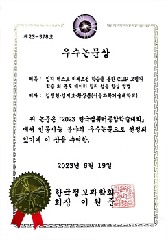 2023년 6월 17일~20일 제주도에서 개최된 2023 한국컴퓨터종합학술대회(KCC2023)에서 일반대학원 데이터사이언스학과 데이터인텔리전스연구실 (지도교수: 황상흠) 소속 서승원, 이수호 석사과정생이 “Cross-Attention을 활용한 새로운 전이 학습 기법”, 김정현 석사과정생, 김지효 박사과정생이 “임의 텍스트 미세조정 학습을 통한 CLIP모델의 학습 외 분포 데이터 탐지 성능 향상 방법” 논문을 발표해 각각 우수논문상을 수상하였습니다.
